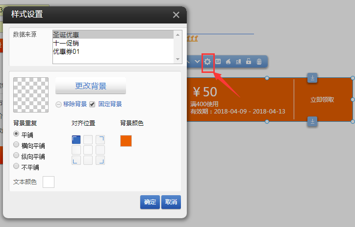 ③.点击设置,数据来源可以选择指定的优惠券,并且可以设置优惠券插件的样式